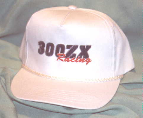 | 300ZX Racing white cotton twill cap. You'll look great in this white 300ZX Racing golf cap. Made of 100% cotton twill it looks great EMBROIDERED with the 300ZX Racing logo. Available in white, one size fits most. $19.95ea. plus $3.95 shipping. Click on the picture to email us your order. Item # 6001 (order this item along with item # 5000 and we will pay shipping to any state in the US.) |
